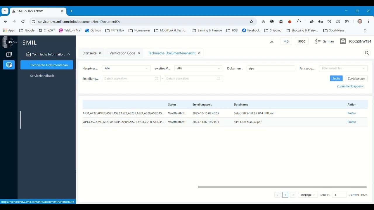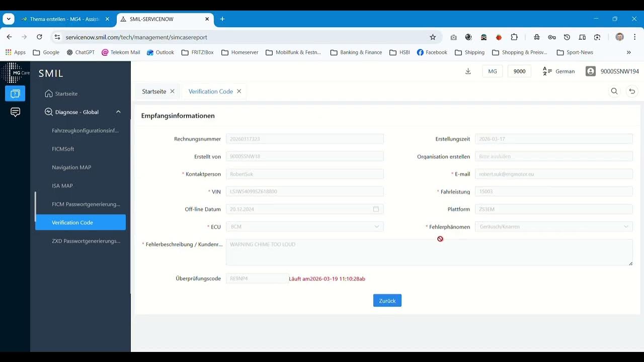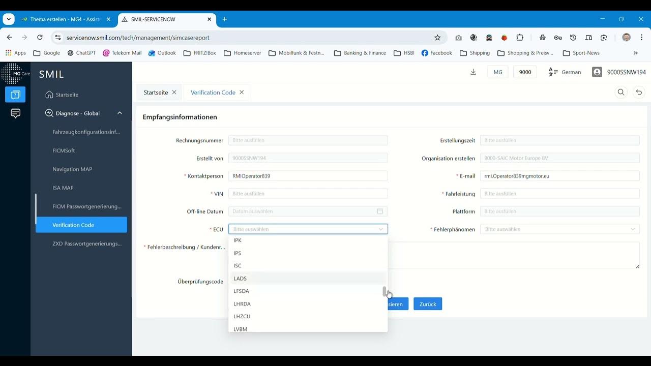 Die beantragten Verifikationscodes sind nicht ewig gültig und laufen zeitnah ab. Als erstes muss man einen Service-Account auf https://rmi.mgmotor.eu/#/user-client/index kaufen (7 € pro Stunde oder 19 € pro Tag, zahlbar via PayPal, Stand 16.04.2026) und mit dem darin enthaltenen SNW Account erhält man Zugriff auf servicenow.smil.com. Nicht wundern, man wird aufgefordert sein erhaltenes Passwort zu ändern. Dieses neue ist damit dann auch das zukünftige Passwort für SIPS. Für die Beantragung des Verifikationscodes braucht man lediglich die eigene VIN und man muss aus einem Auswahlmenü wählen, welches Steuergerät geupdatet werden soll. Die Kurzbezeichnungen werden in SIPS erklärt, wie FCM oder FVCM. Die Felder mit der Begründung und der Fehlerbeschreibung müssen zwar ausgefüllt werden, dienen aber lediglich statistischen Zwecken.